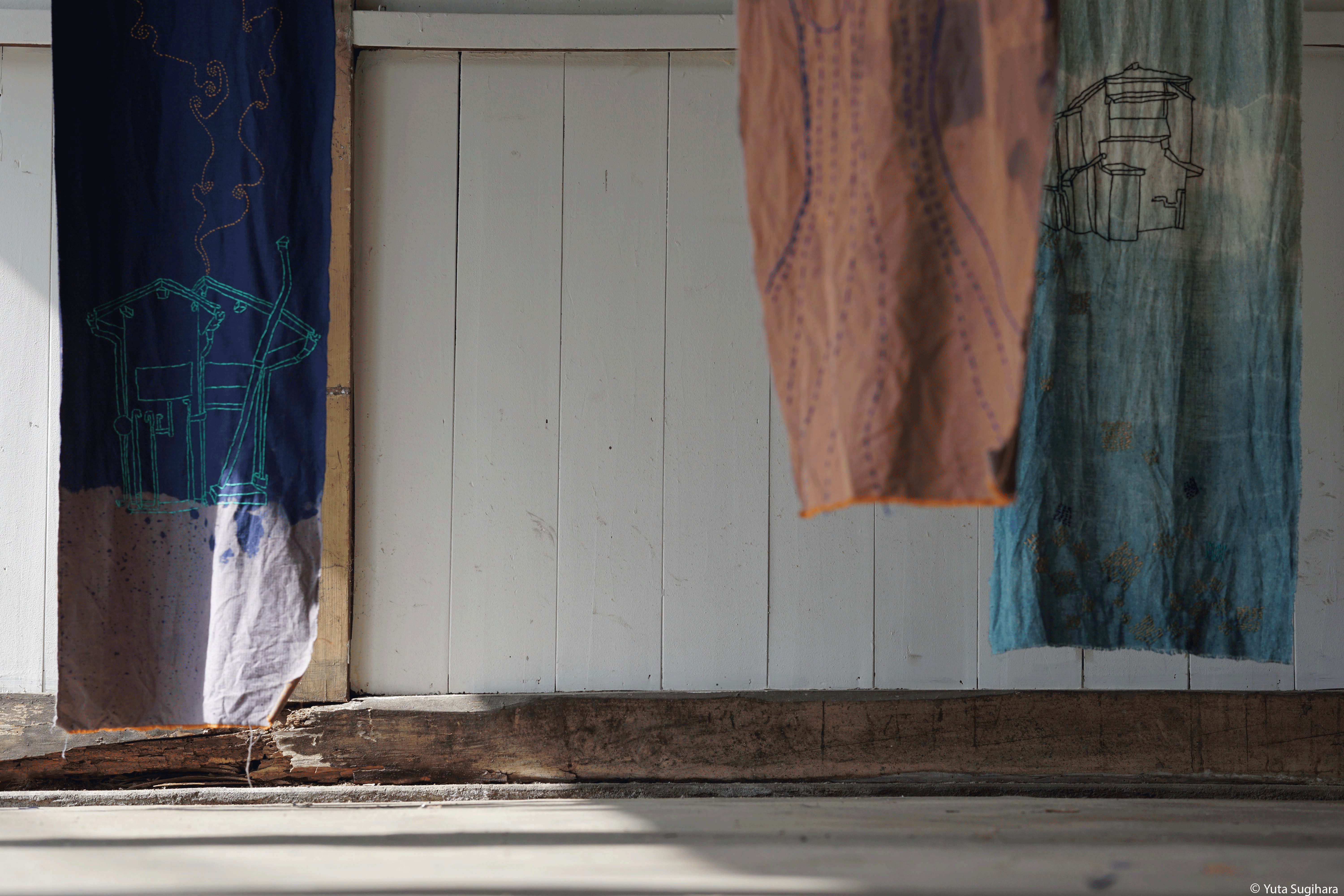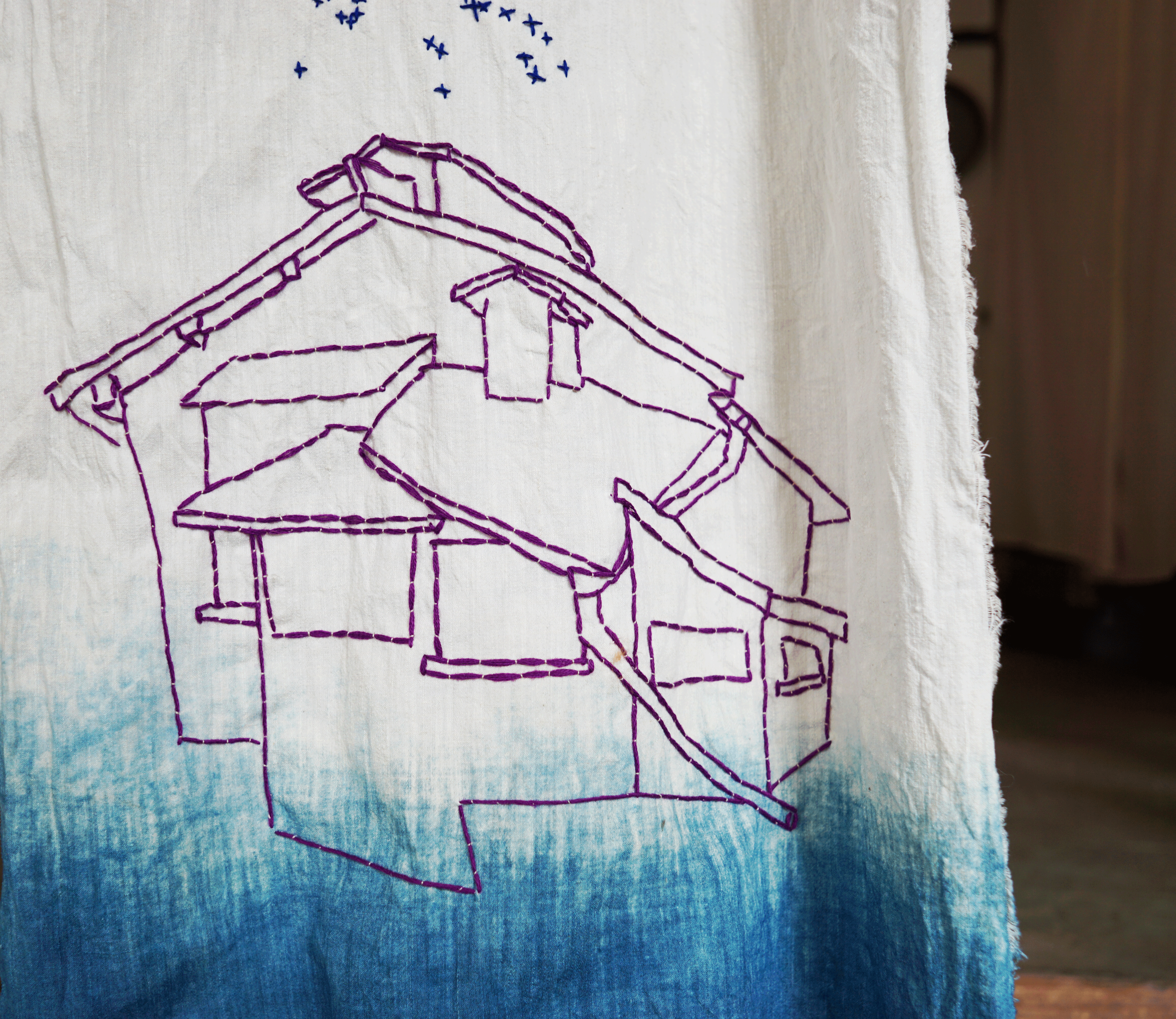 Manufacturés dans la ville, prenant l’apparence de kakejikus, les textiles prennent la couleur de l’indigo. C’est par la variation de cette teinture que j’ai choisi de figurer les irrégularités formées par la rouille présente sur les maisons. Cette impression de «bulle d’un ailleurs» est rehaussée par la technique lente et intemporelle de la broderie, à travers laquelle j’ai interprété des motifs traditionnels japonais.