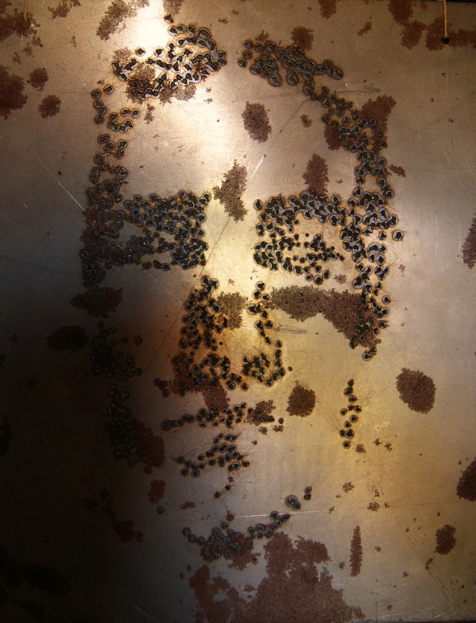 Plates of metal, burned, rusted, dotted, as if demanding to be connected.