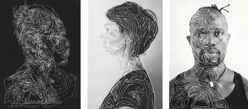 « Face – Profil droit – profil gauche », tel est le canon de Bertillon pour ses anthropométries judiciaires. En empruntant ce canon comme base de cette série photographique et en y superposant les codes graphiques des cartes typographiques, j’obtiens des portraits brouillés.