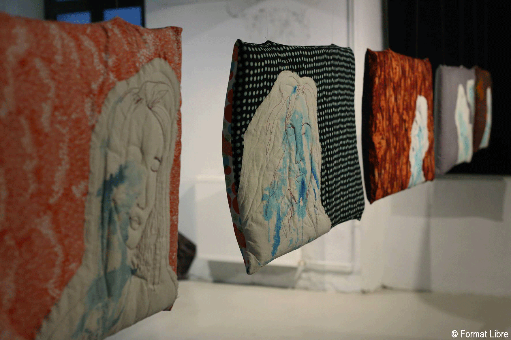 These sleepy faces aren’t choose by hazard : they all have the common point of having dozed beside me. The figures register at the fabrics with thread to fix the shared moment, like a stop motion. Such a « pillow confidence », or the story you tell before a deep sleep, tinted from a huge complicity you should have to get sleeping on your « two ears ». The pillows are vertically disposed like a sewing portrait gallery : just my own presence is erased, leaving a free place for a new partner.