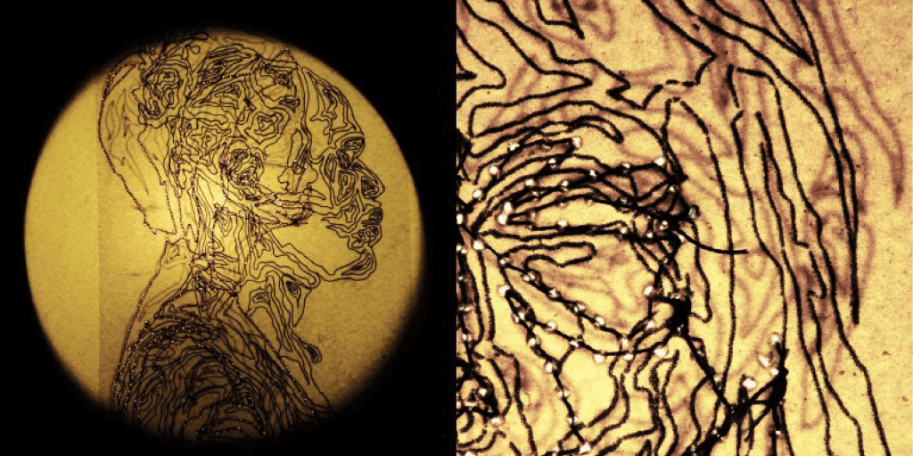 Par la lumière, une constellation se forme et des visages s’entremêlent, se projettent les uns au dessus des autres, jusqu’à s’étioler.