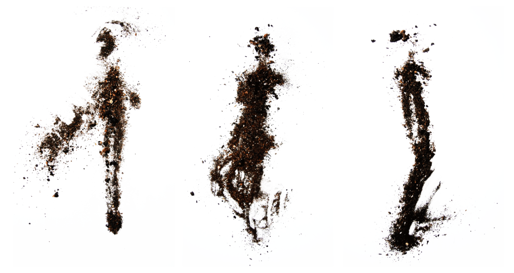 The silhouettes are formed from soil samples trodden under my feet and thrown onto paper.