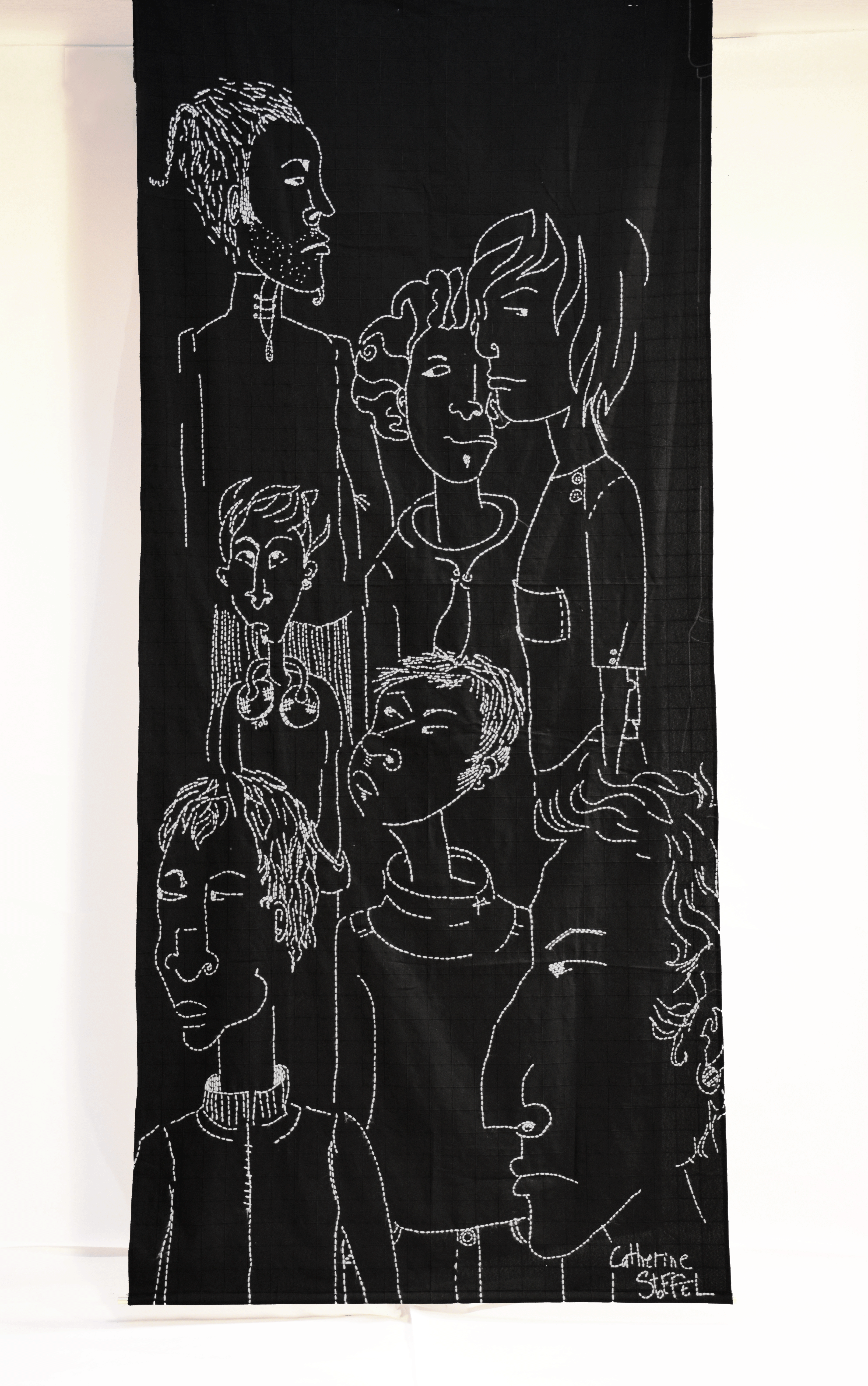 Les taies d’oreiller sont à la verticale, disposés à la manière d’une galerie de portraits cousus, seule ma présence étant effacée pour laisser place libre à de nouveaux partenaires.