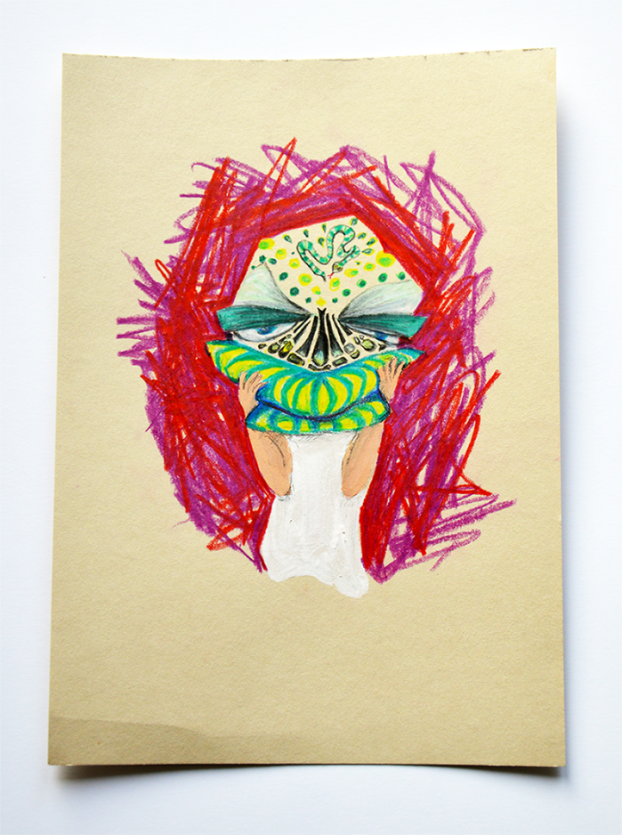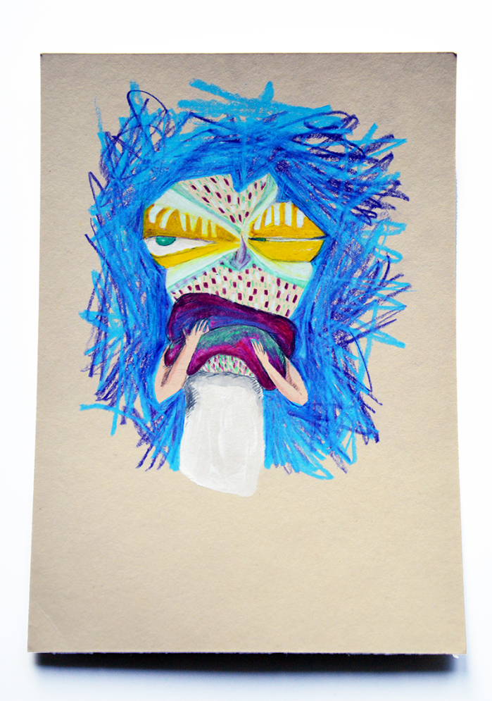 Prenant mon courage à deux mains afin d’observer les alentours, j’ai sorti un oeil de ma grotte de plume. Rien. Rien n’a bougé… pourtant dans le noir, un nouveau monde a pris forme. Ces terreurs nocturnes qui ont habité nos esprits d’enfants, refont surface dans nos coeurs d’adultes. « T’avais peur de quoi toi? » C’est en interrogeant les membres du Collectif Format Libre sur leurs propres peurs que j’ai créé ces masques qui ont fait l’objet de support pour une médiation singulière lors de l’exposition « Même pas peur » au centre d’art contemporain Ateliers des Arques.