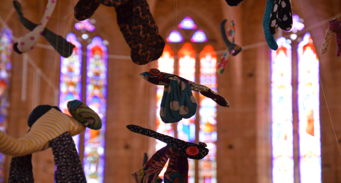 Immersive Installation; fabrics, thread and sequins. (60 pieces textile dragonflies)