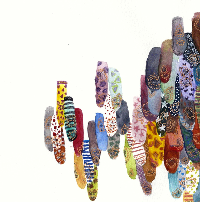 Avec la récolte des chaussettes de mes compagnons de route, j’ai souhaité figurer le temps partagé.